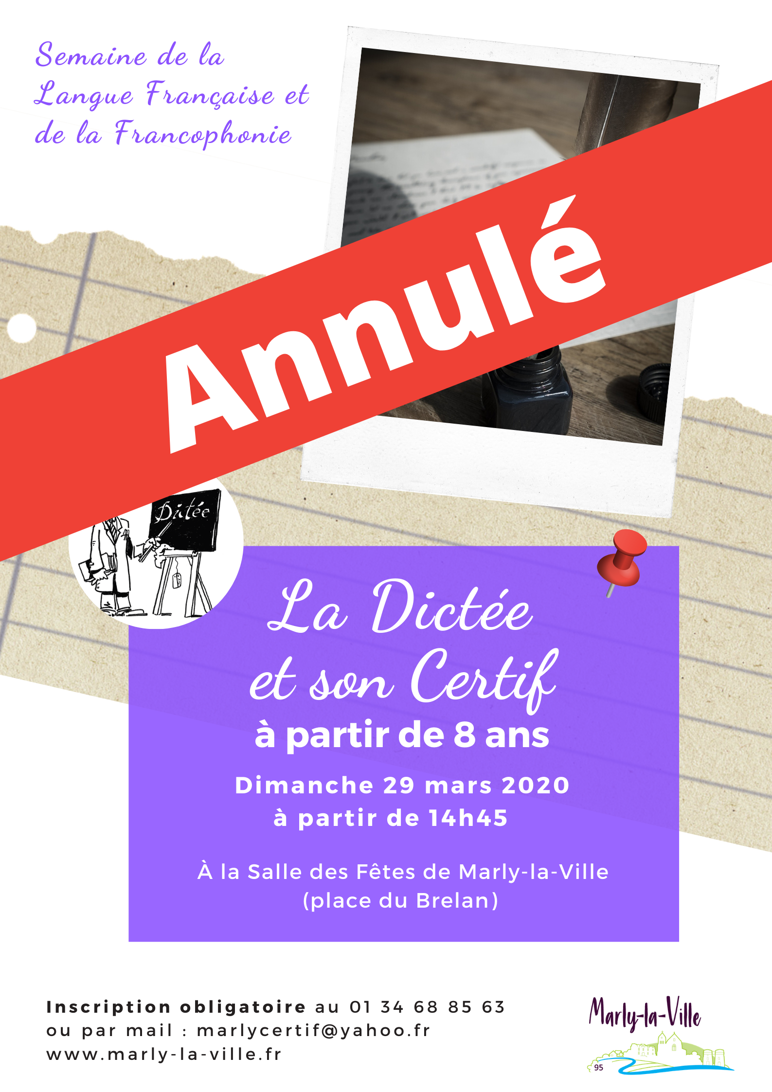 Par mesure de sécurité et de prévention, la municipalité vous informe l’annulation de la Dictée et son Certif’, prévue le dimanche 29 mars 2020.