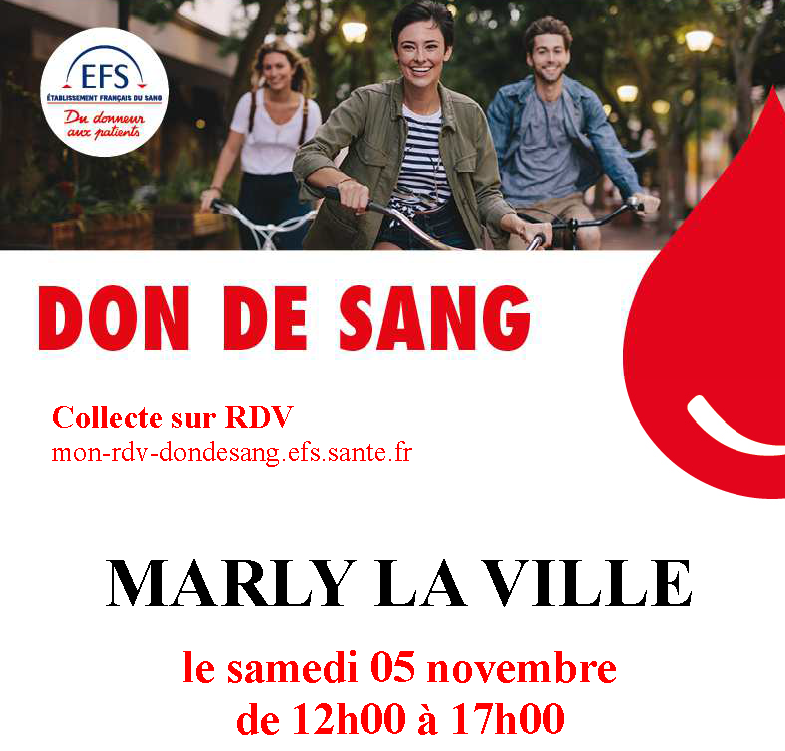 La prochaine collecte de l’Etablissement Français du Sang (EFS) aura lieu le samedi 5 novembre, de 12h à 17h, à la Salle des Fêtes rue du Brelan.