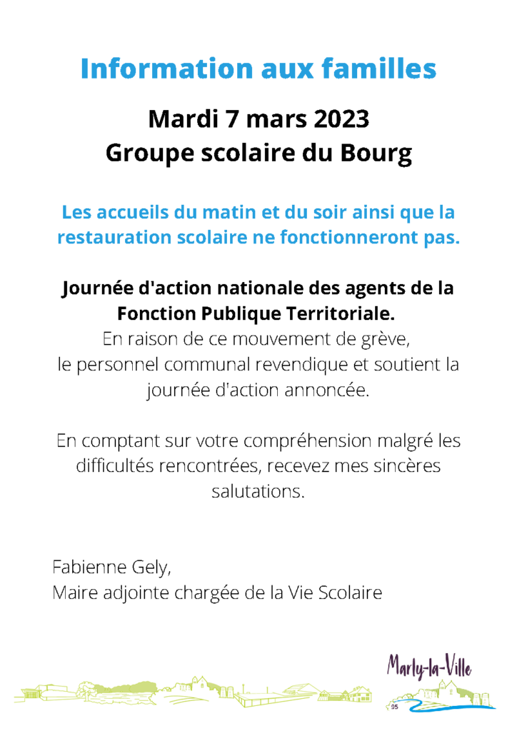 - Groupe scolaire du Bourg : les accueils périscolaires (matin et soir) ainsi que la restauration scolaire ne fonctionneront pas.