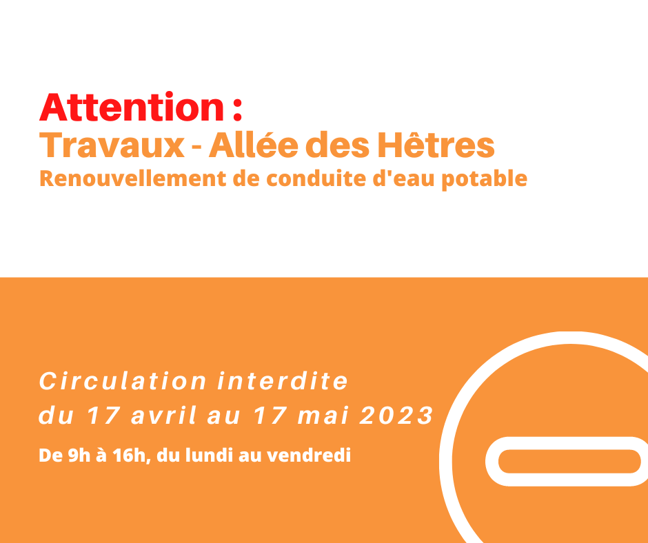 Des travaux de renouvellement de la conduite d’eau potable, allée des Hêtres, impacteront la circulation du 17 avril au 17 mai.
